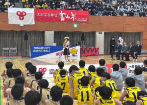 春季ミニバスケットボール大会の閉会式にて、富山米のPRをさせていただきました。